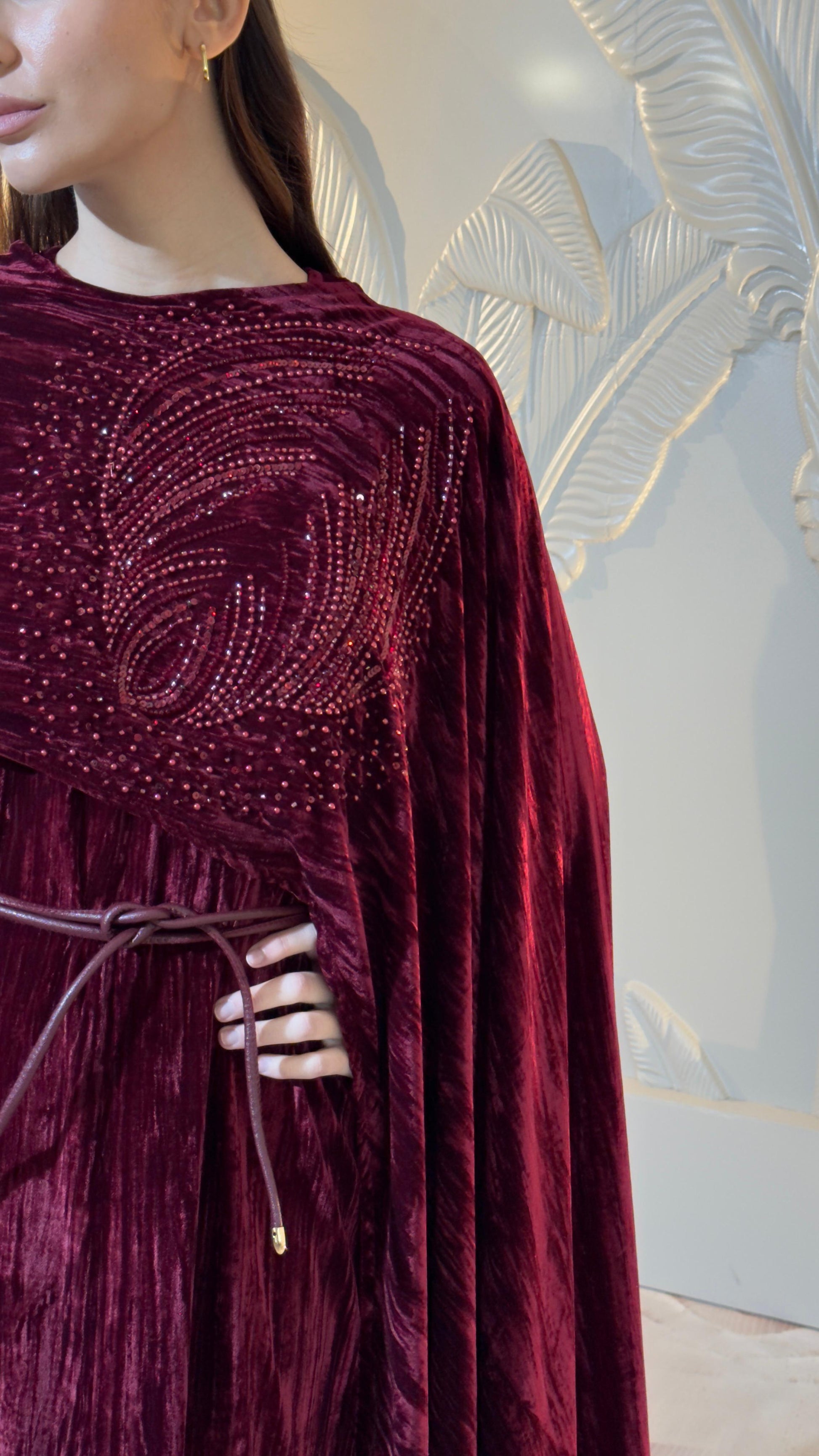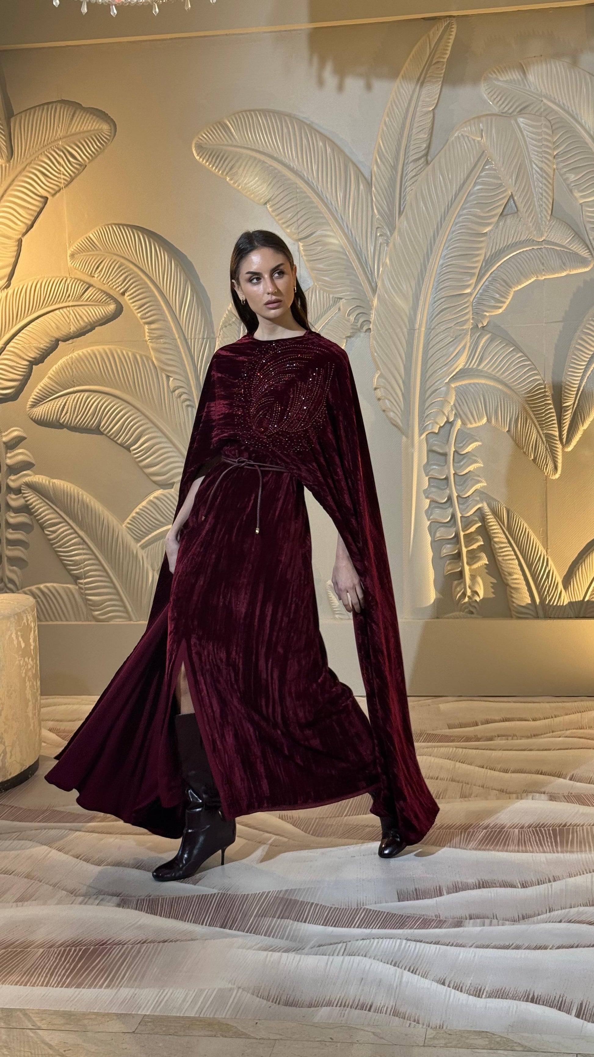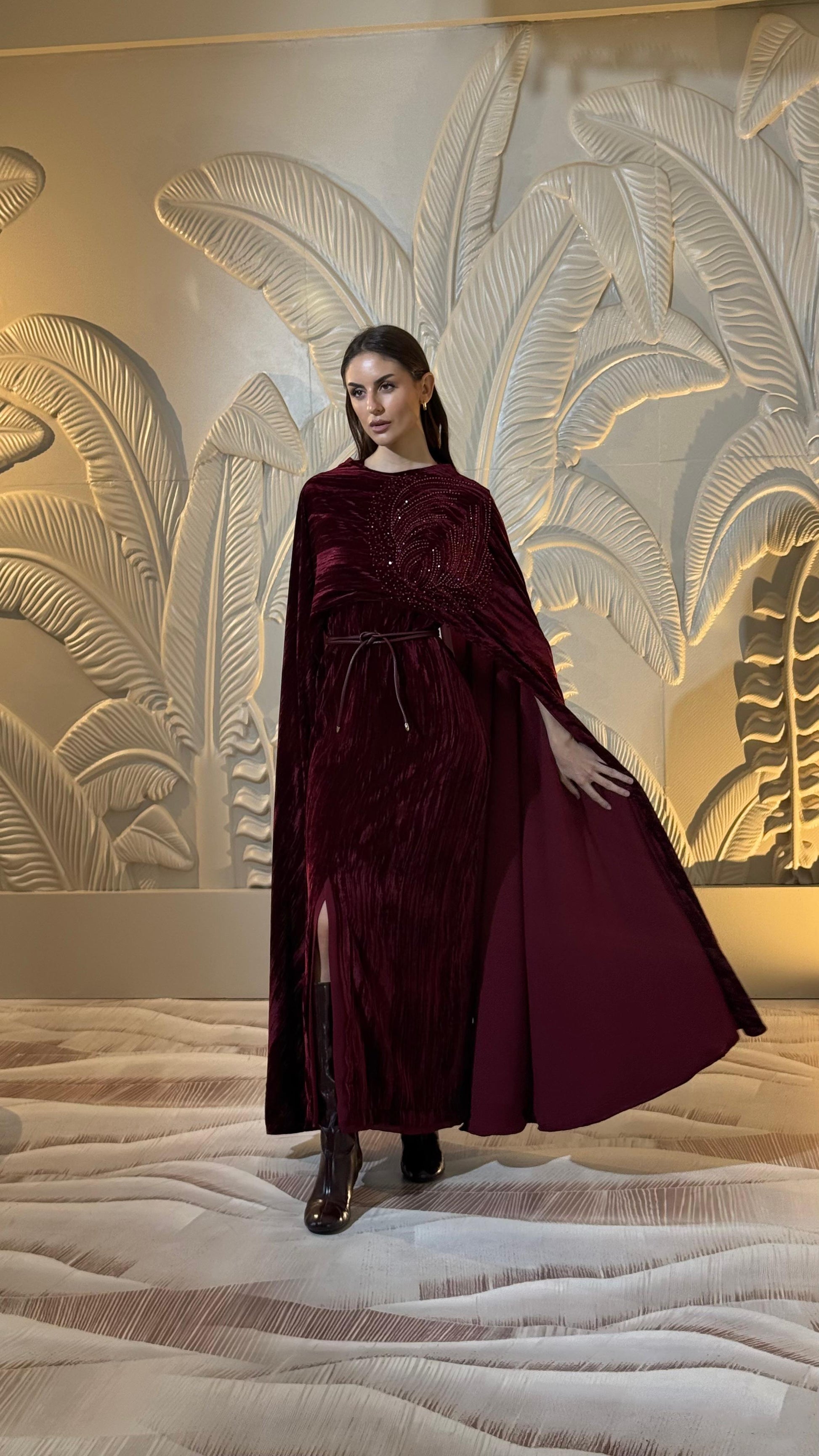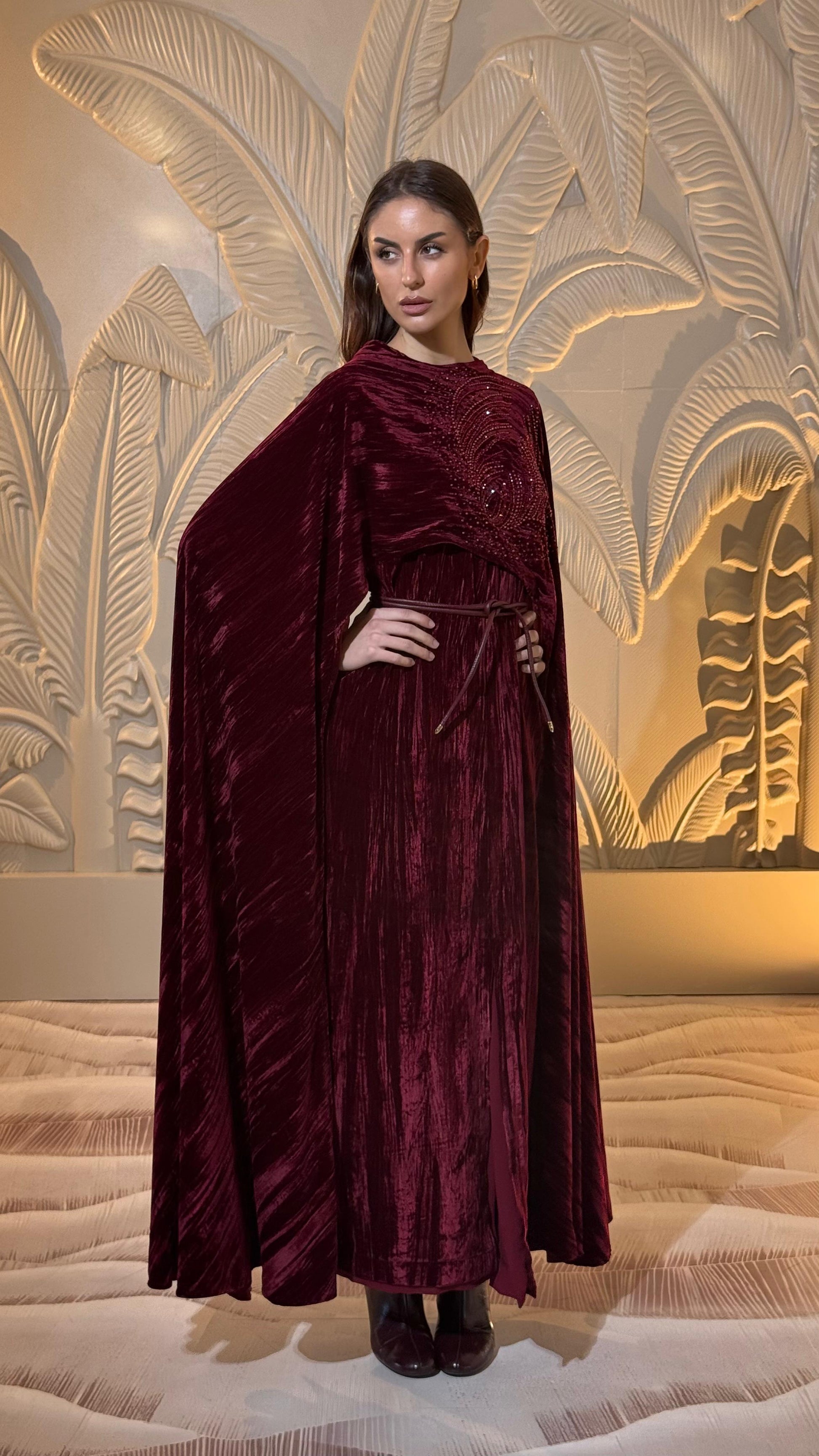 Velvet dress , crystal embroidered cape and belt set.